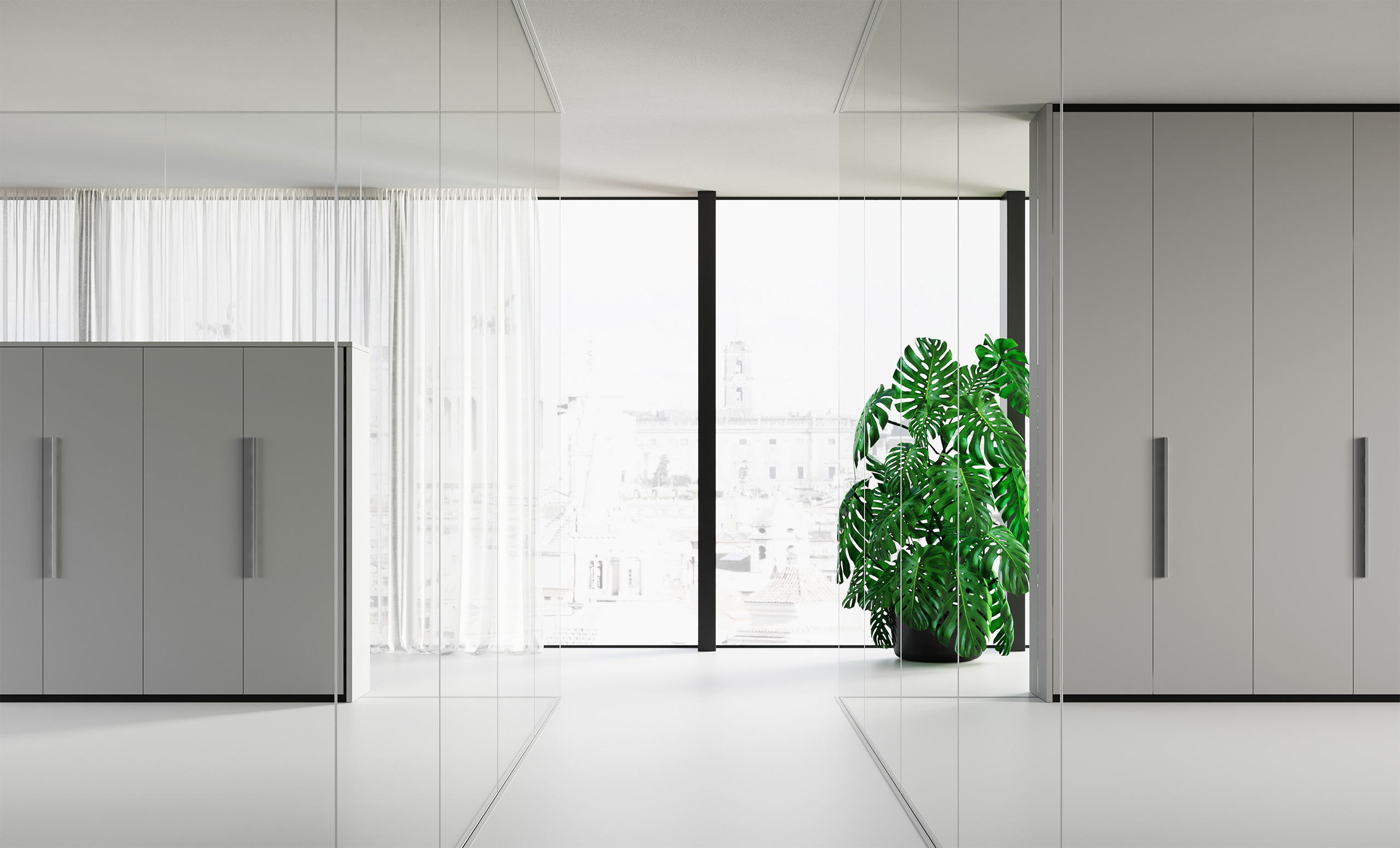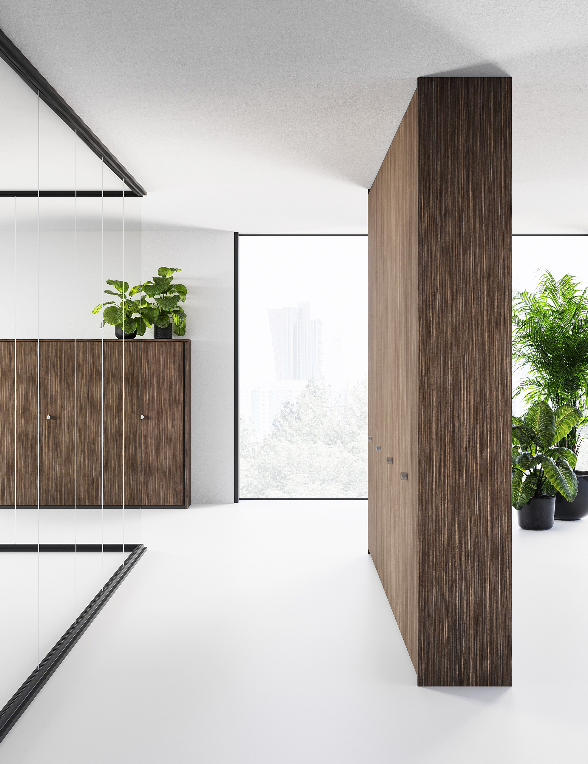 Una parete attrezzata a contenitore che si integra perfettamente con le pareti divisorie di produzione Las Pareti creando giochi volumetrici di grande suggestione. È la modalità ormai consolidata che unisce le funzioni di separazione a quelle di stoccaggio, garantendo uniformità di allestimento e variabilità funzionale.