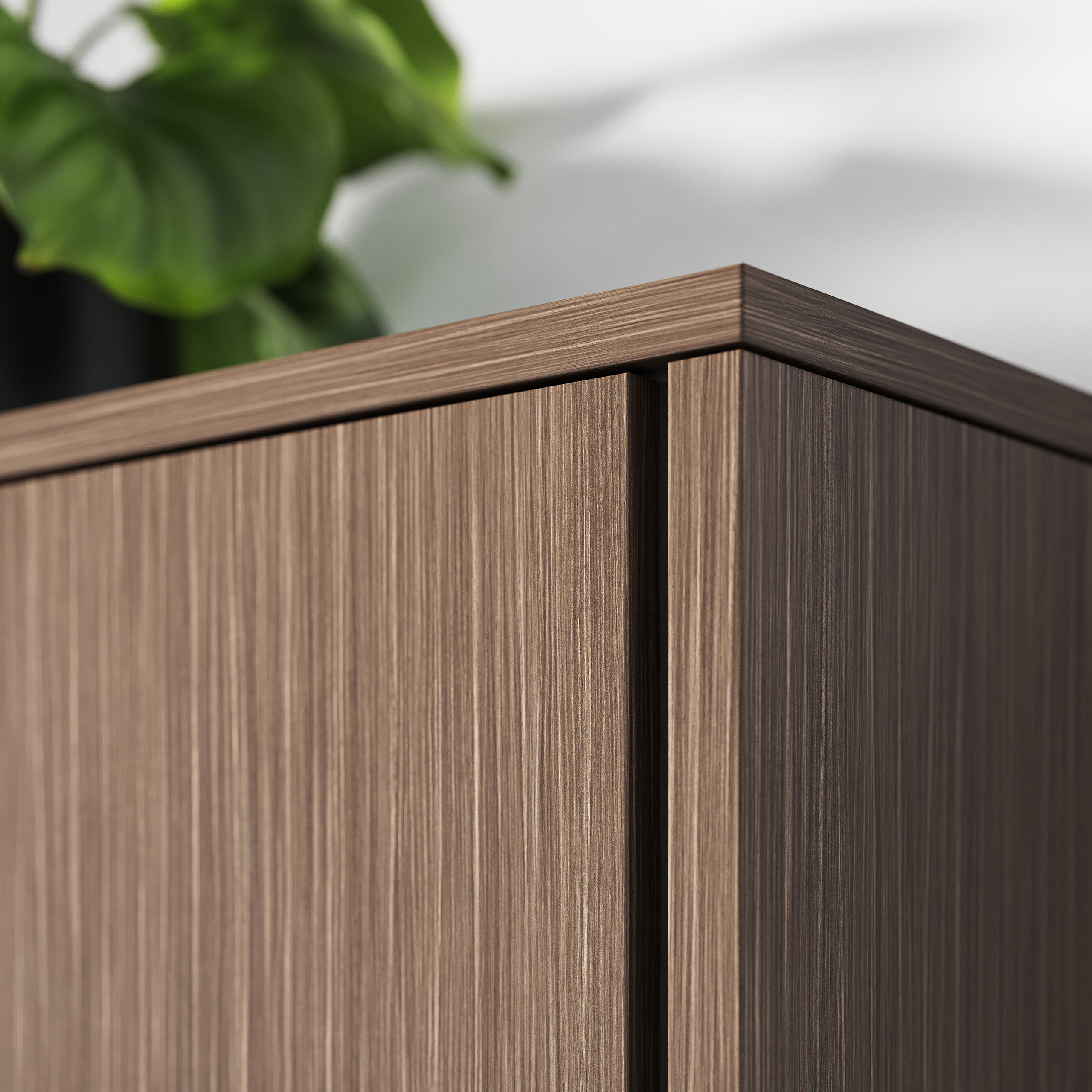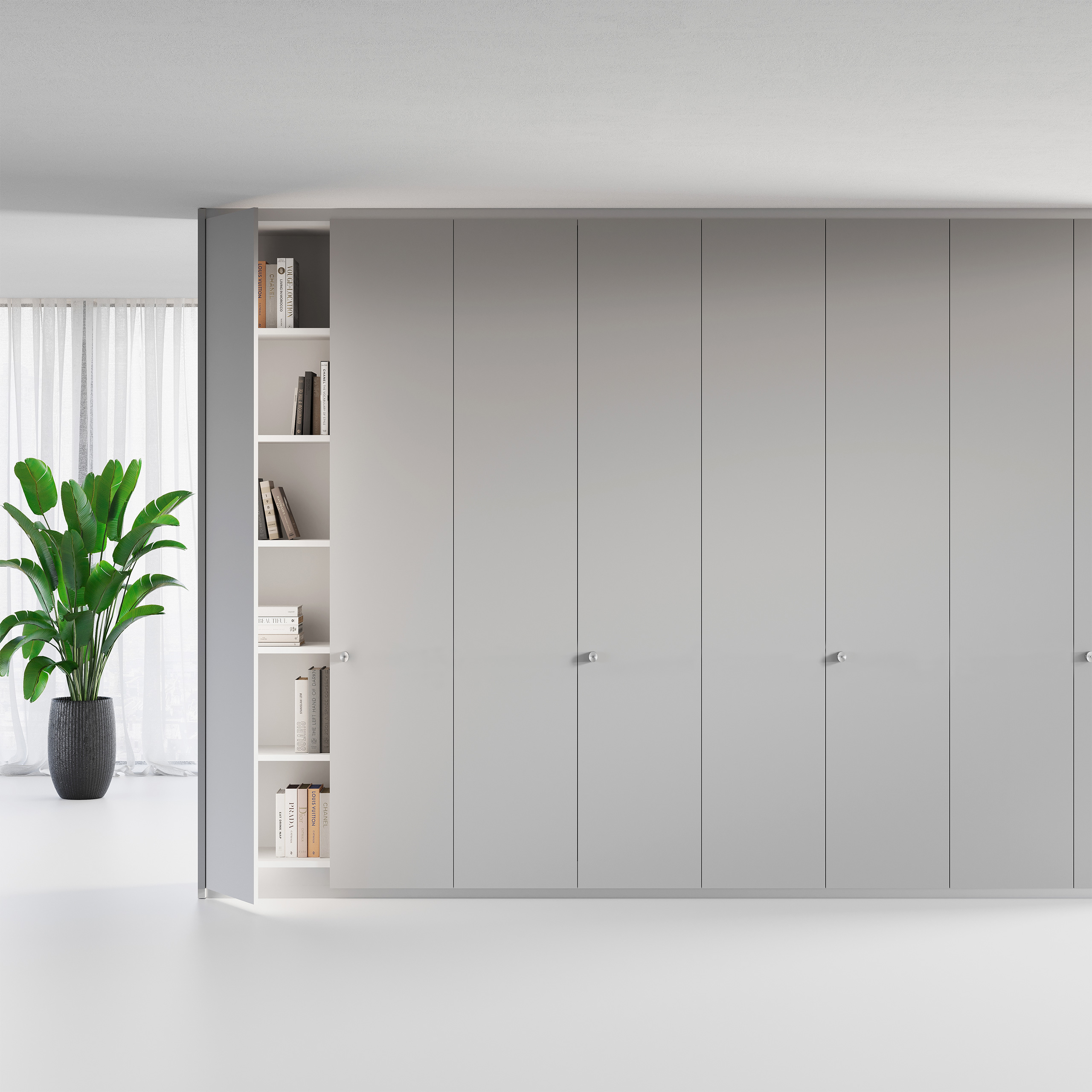 Parete organizzata a moduli di larghezza 50 e100 cm con sistema di assemblaggio a spalla portante secondo altezze standard, con moduli di compensazione fino al soffitto, o in altezza di vano con ante a misura. È composta da elementi strutturali, ante e schienali in pannelli nobilitati di legno e ripiani interni in legno o metallo.
