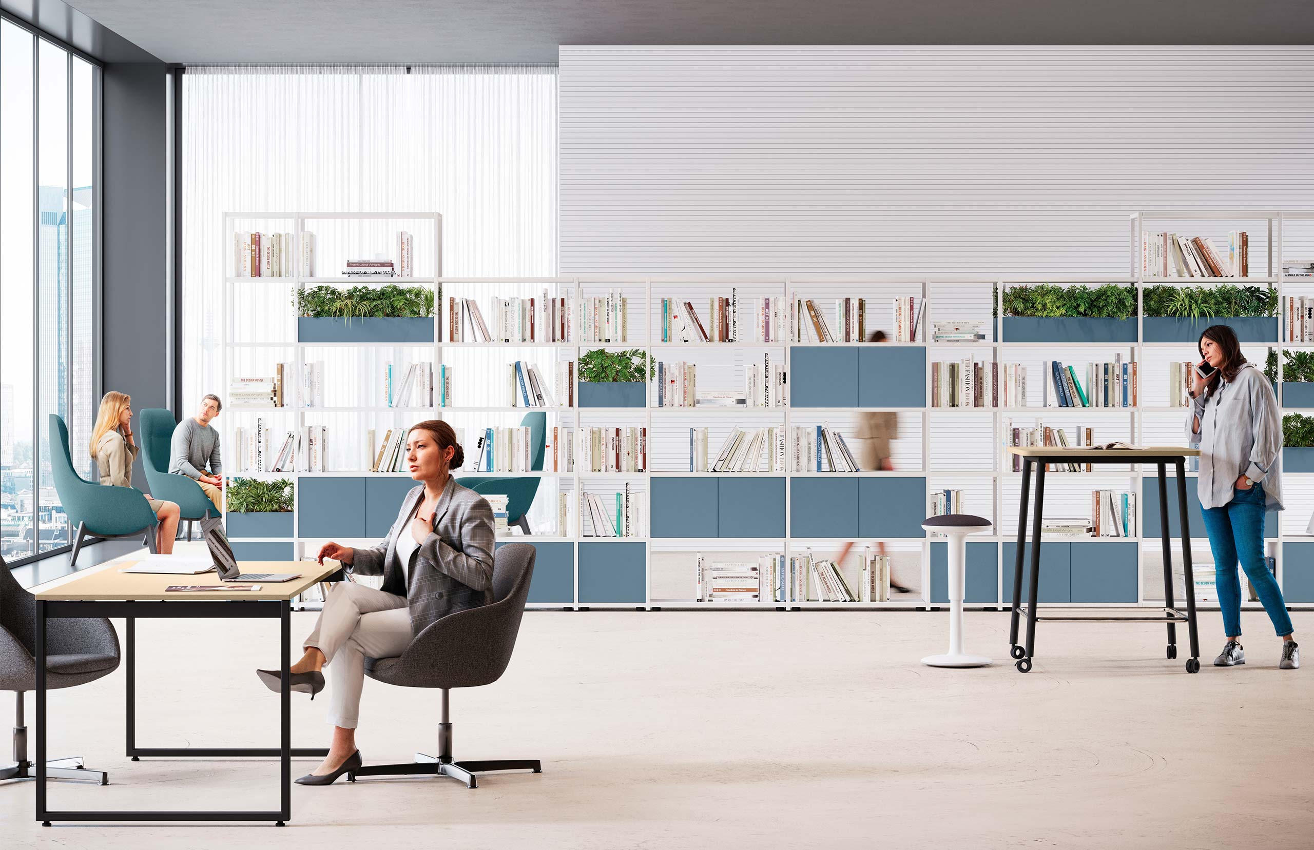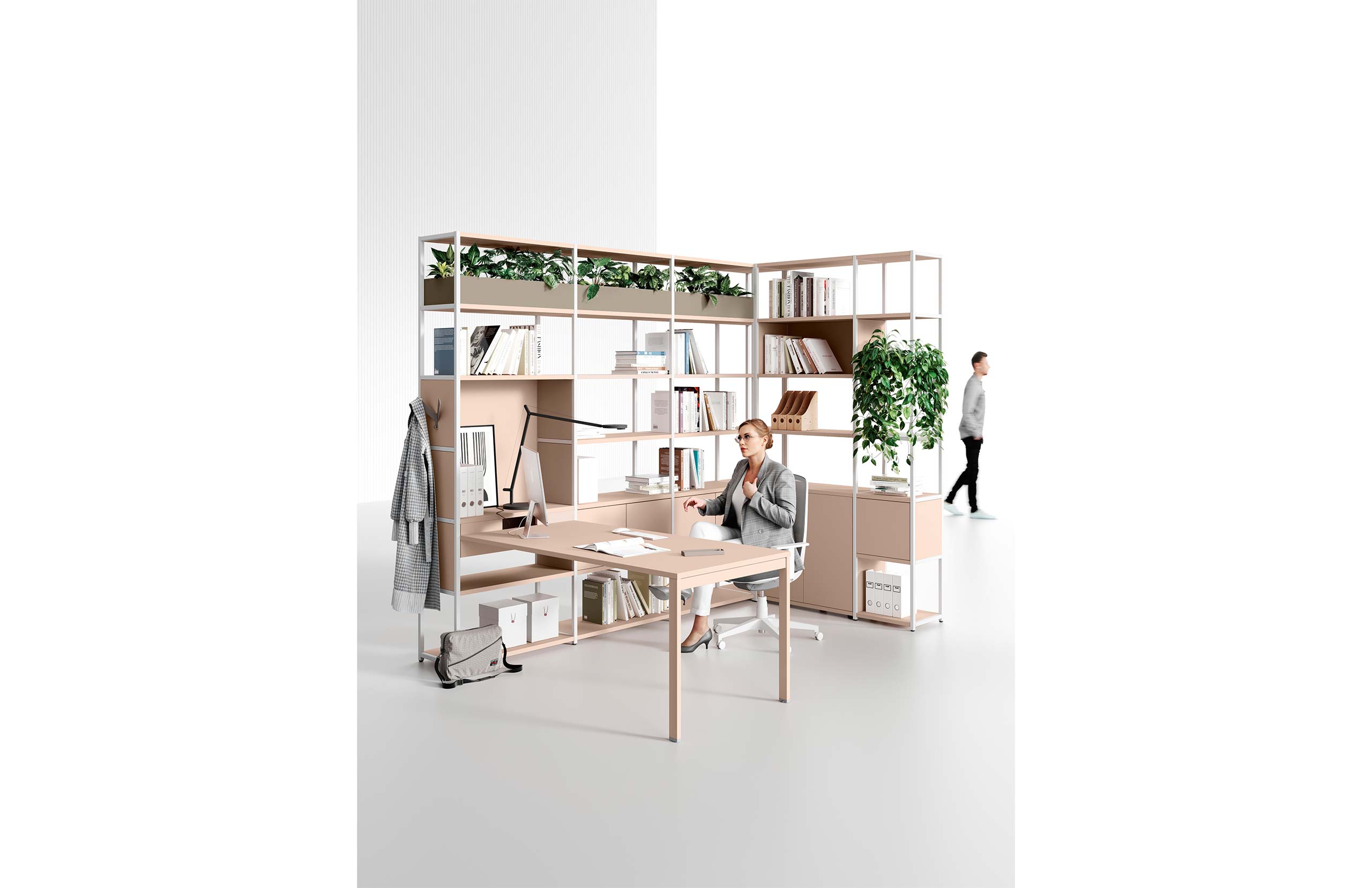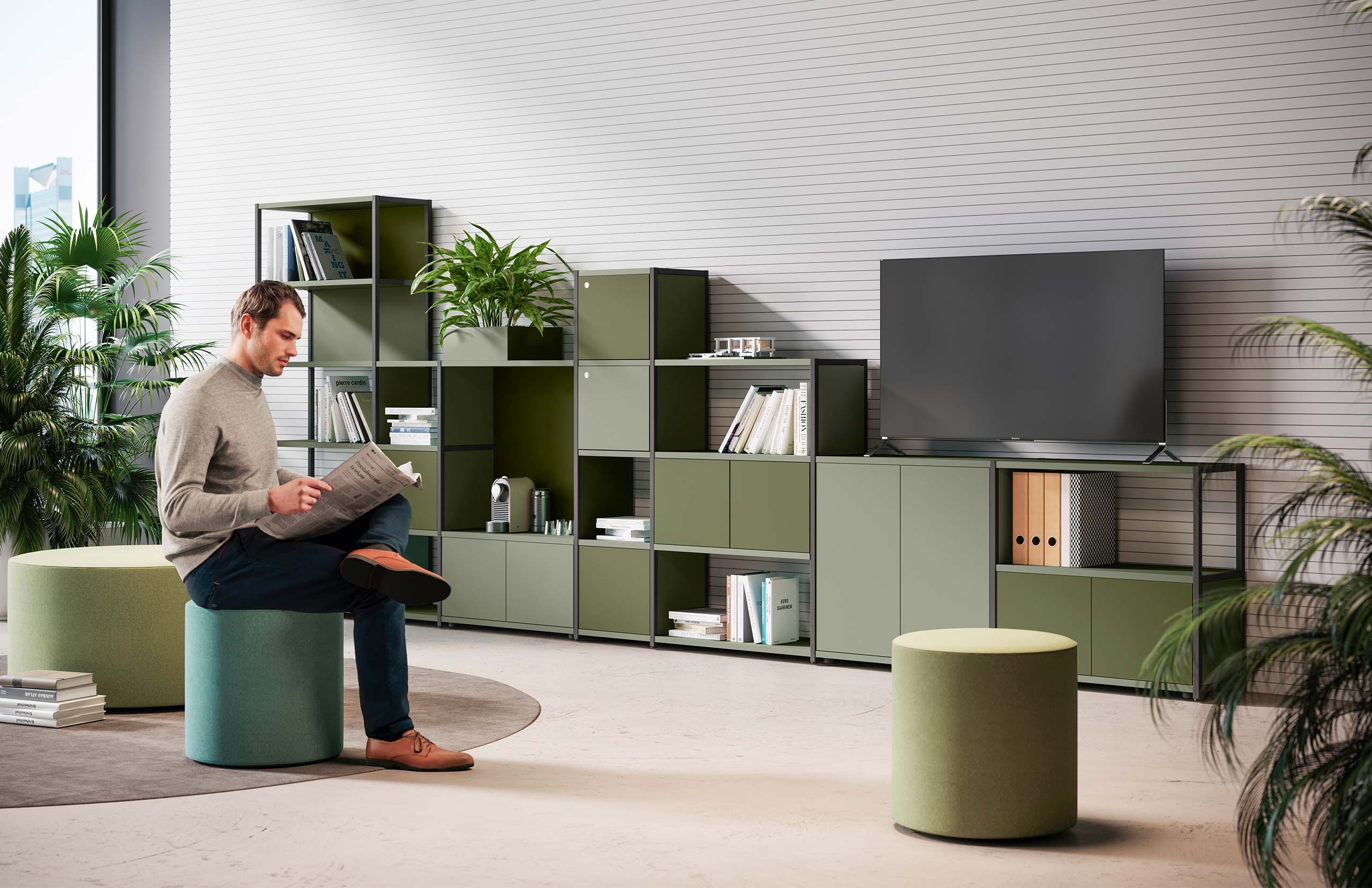 Il suo sistema modulare e componibile, accompagnato dalle quattro altezze dei fianchi e da schienali e fianchetti, consente di progettare in piena libertà composizioni con nicchie aperte e chiuse.