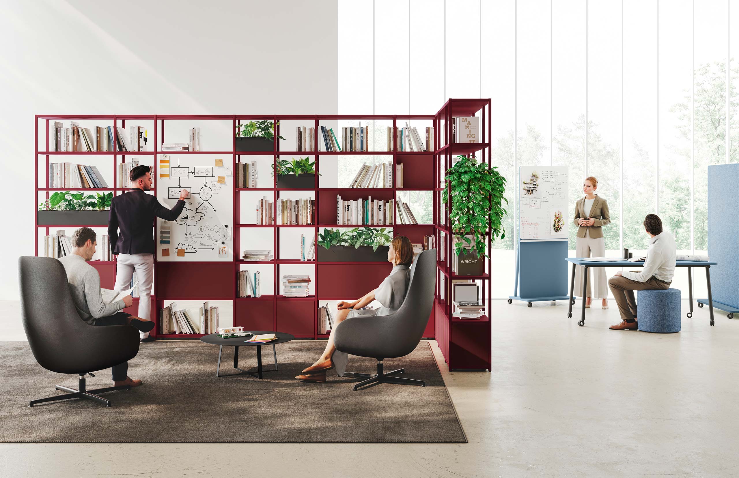 Una libreria leggera, semplice, essenziale che assume unicità e personalità grazie ai colori, coordinati e combinabili, della sua struttura metallica e dei suoi contenitori e ripiani in legno.