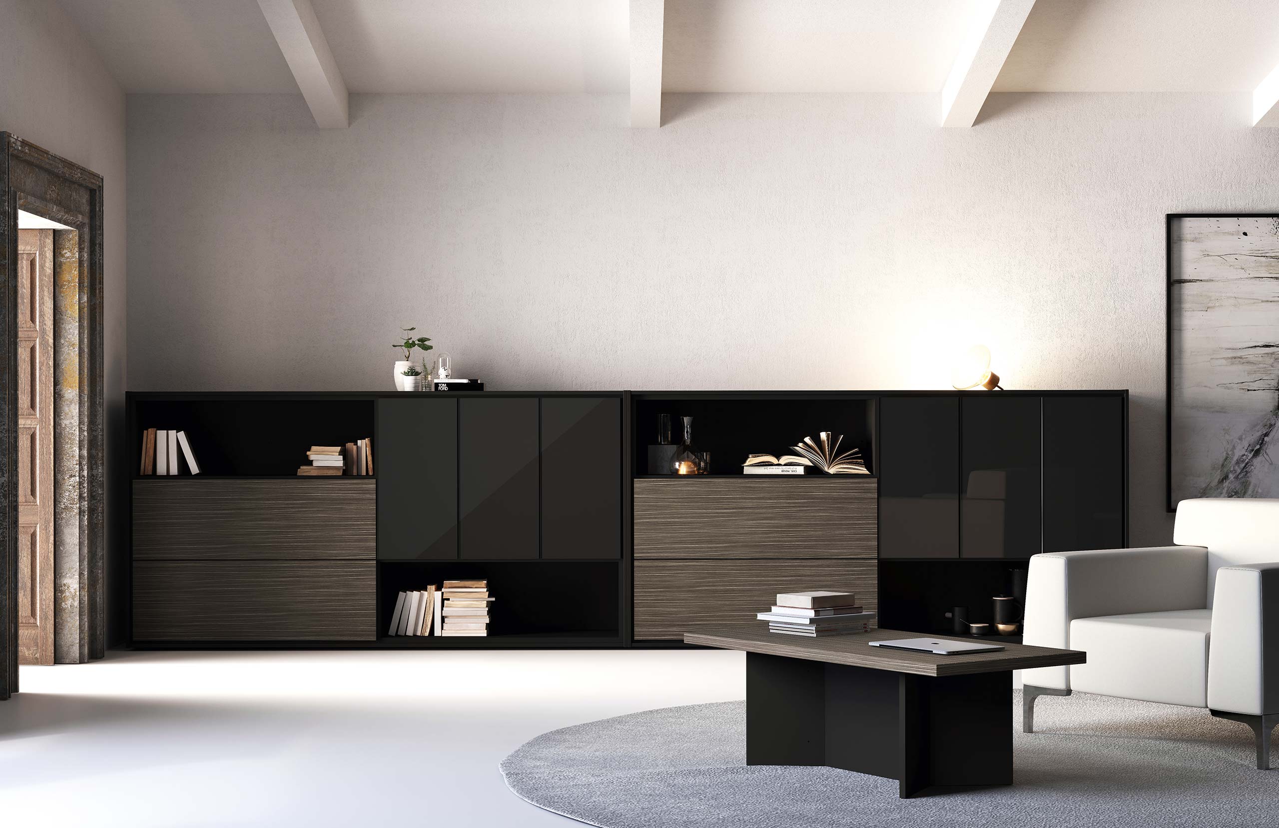 - Contenitori in 2 altezze con ante scorrevoli, a battente o a cassettoni