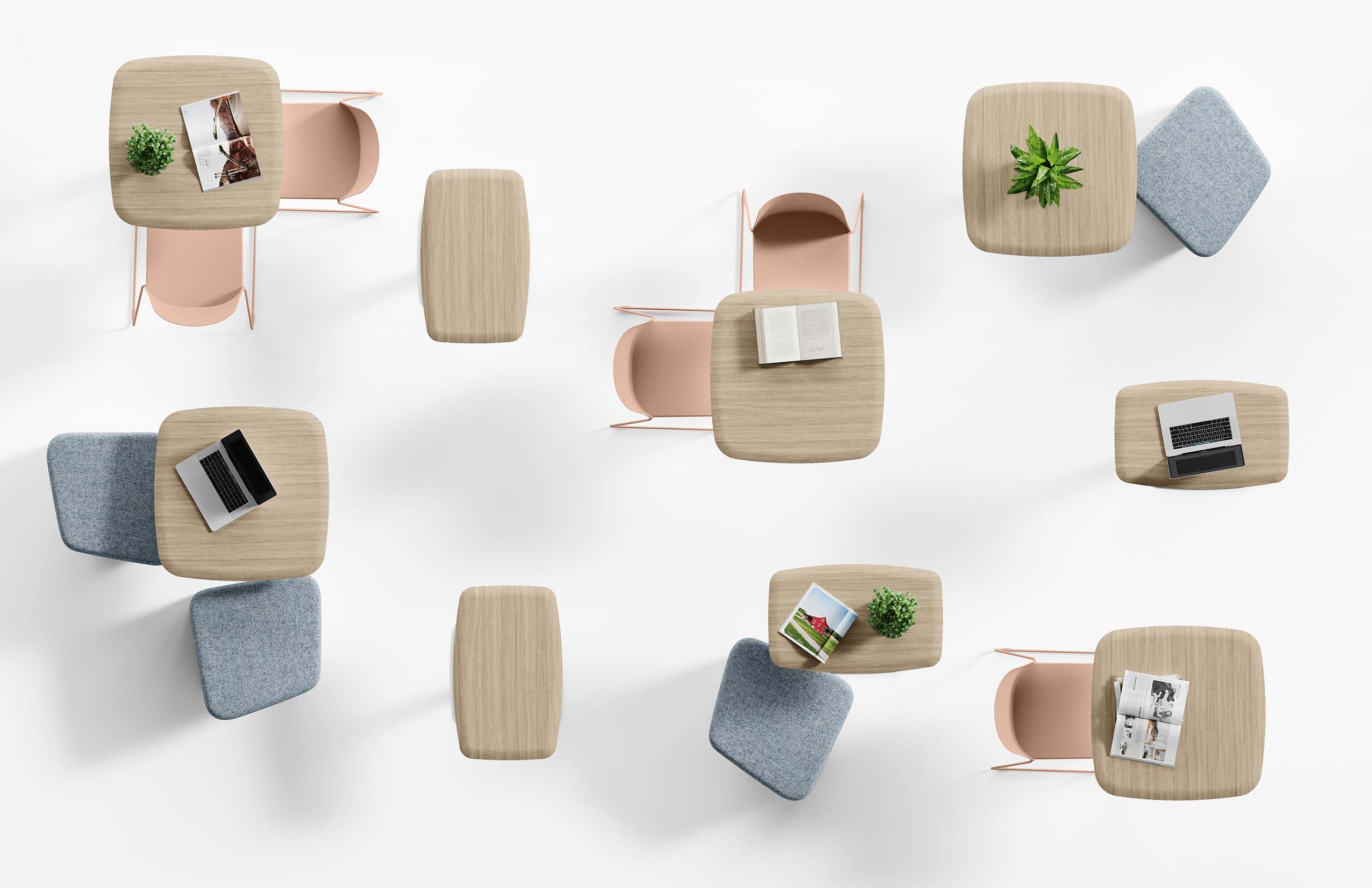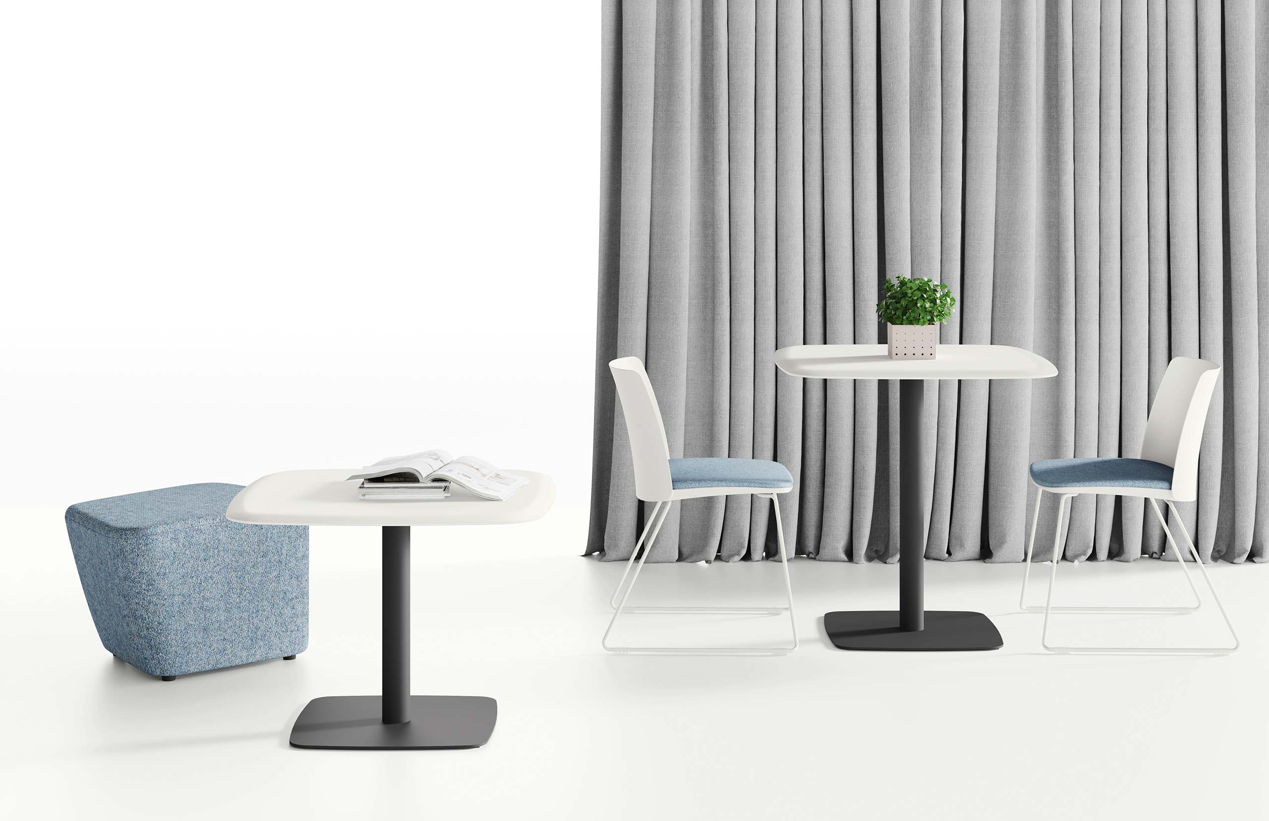 Tavoli a basamento centrale con piani rettangolari e quadrati in due altezze, break e pranzo. I piani, con i bordi arrotondati e rivestimento in 3D Foil, sono comodi e facilmente pulibili. Il basamento annulla gli ingombri perimetrali favorendo l’uso perimetrale.