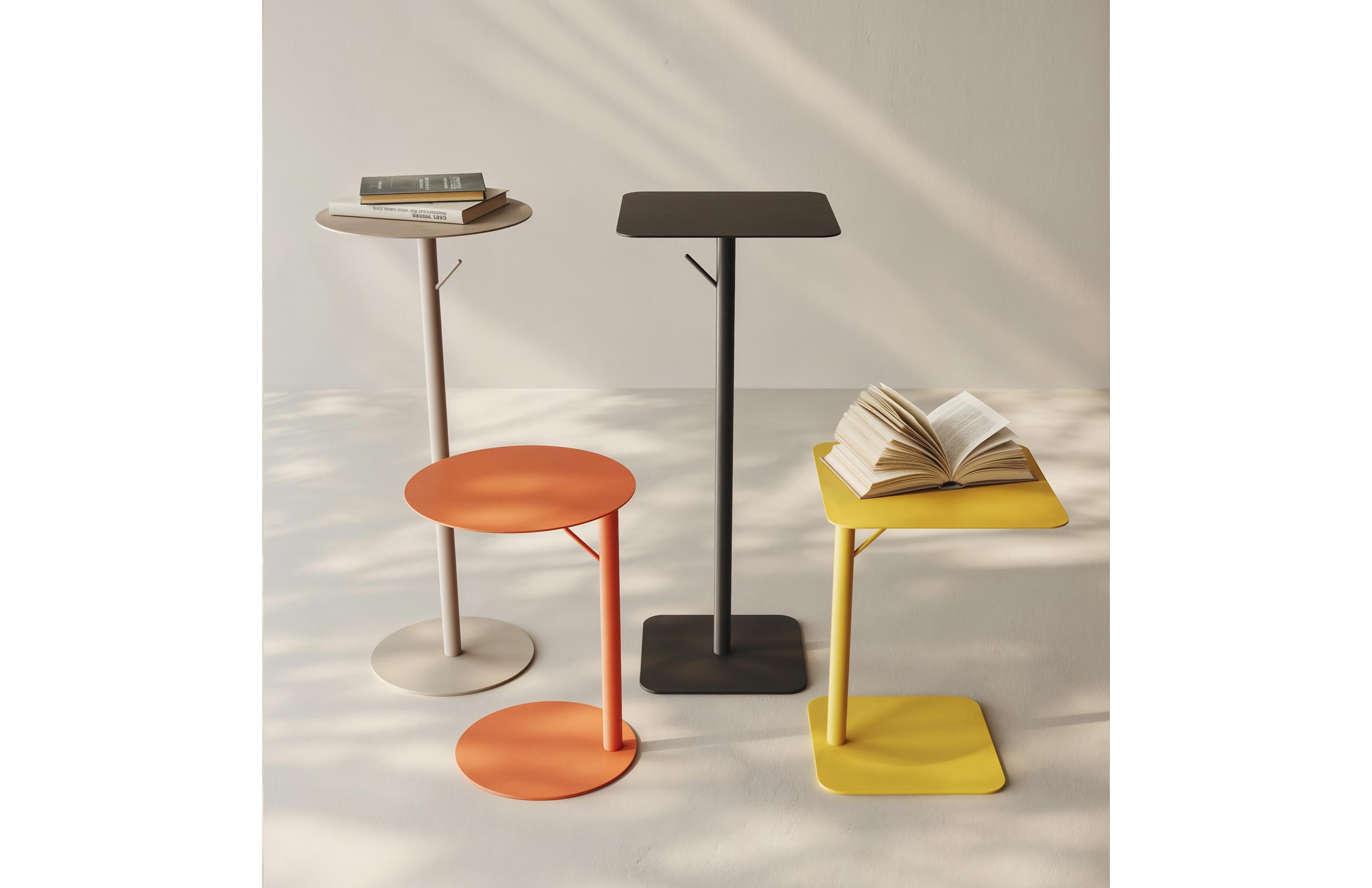Collezione tavolini in metallo previsti in due altezze per arredare zone lounge, horeca o ideali per micro-postazioni di lavoro. Le versioni basse ideali per essere affiancate a divani e poltroncine. Previsti di gancio per appendere borse e zaini.