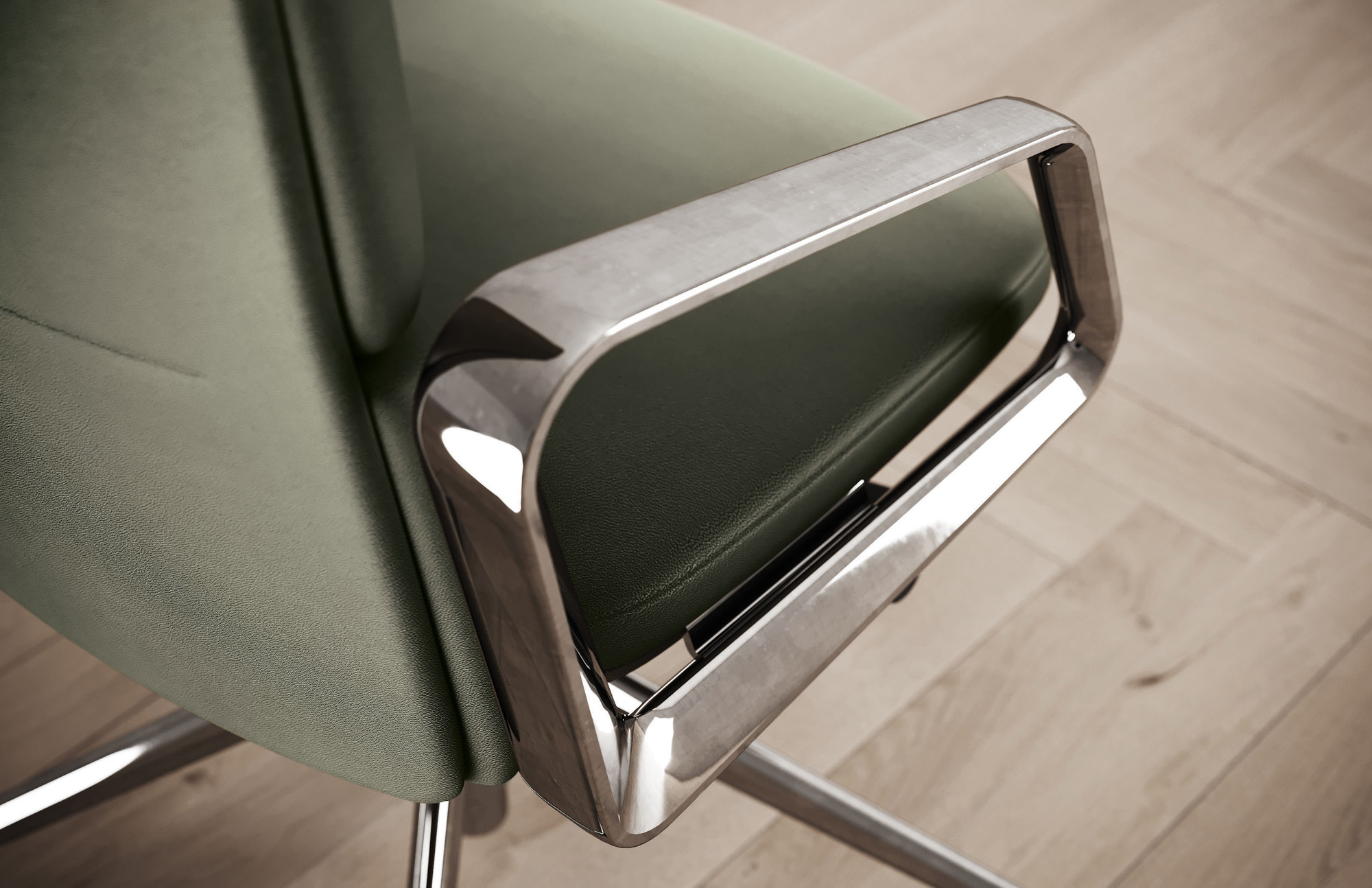 Una collezione di poltrone direzionali di grande prestigio, articolata in tre altezze di schienali e due tipologie di braccioli, in pressofusione di alluminio e imbottiti.