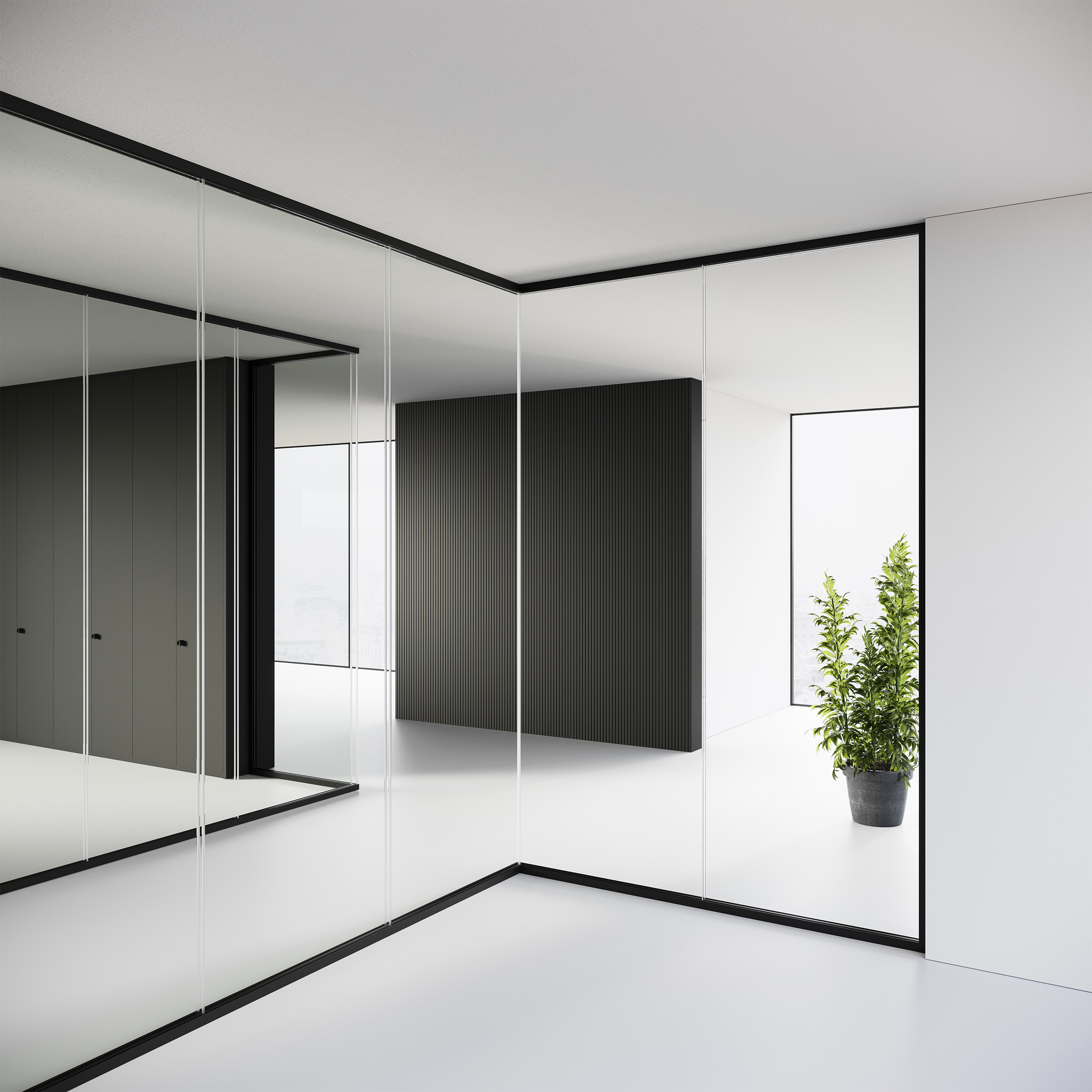 Parete doppio vetro che accoglie lastre autoportanti da 10/11 o 12/13 mm, studiata per ottenere elevate prestazioni di abbattimento acustico, mantenendo uno spessore di soli 50 mm. Si integra perfettamente con le altre versioni di Mood impiegandone tutti gli accessori, connessioni tra moduli vetrati e porte a battente e scorrevoli.