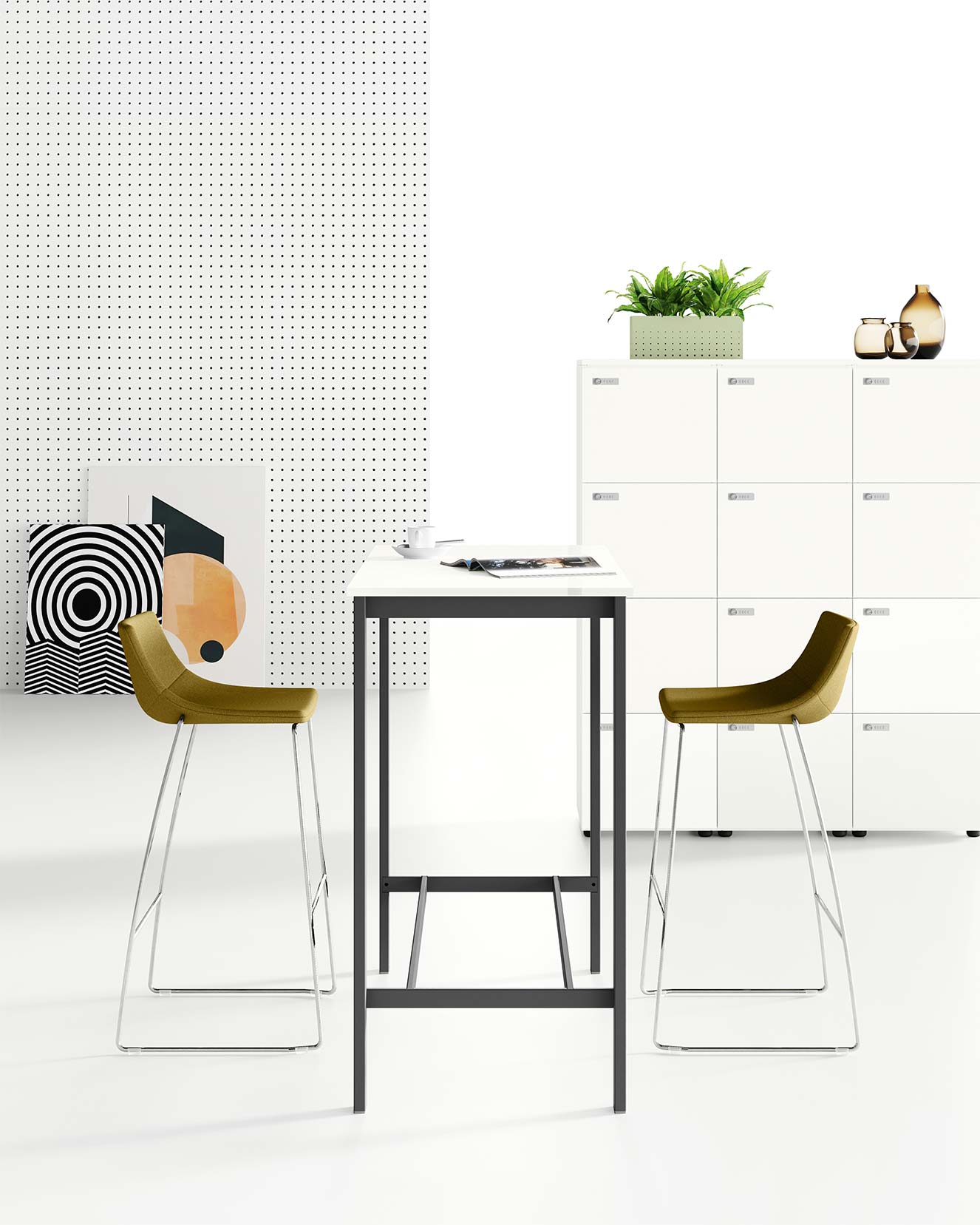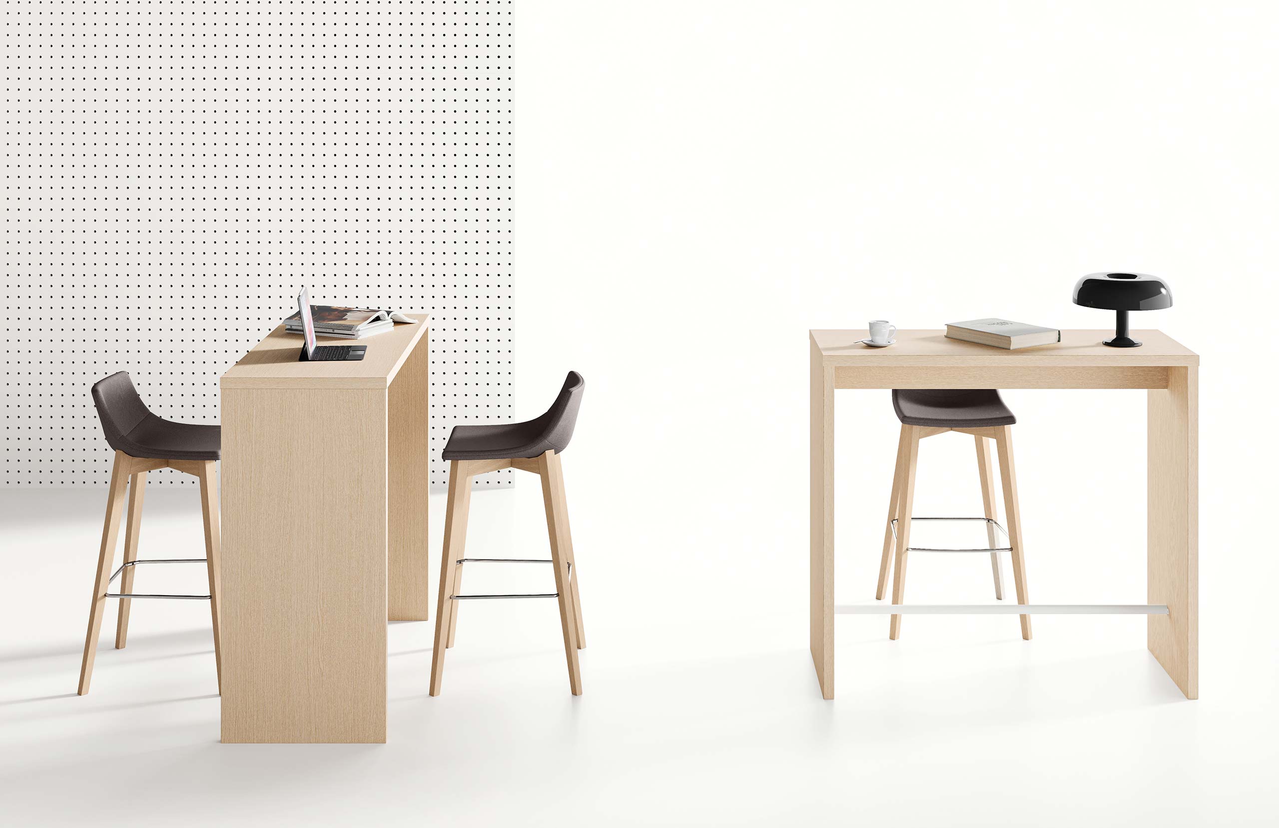 Tavolo break alto con piano rettangolare in legno o vetro e struttura metallica a gambe perimetrali e barre poggiapiedi.
